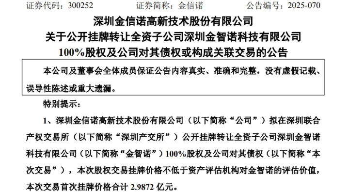 9月18日,金信诺(300252)公告,公司拟在深圳联合产权交易所公开挂牌转让全资子公司深圳金智诺科技有限公司100%股权及公司对其债权。首次挂牌价格合计2.99亿元,其中股权转让价格为20,974.74万元,债权转让价格为8,897.90万元。