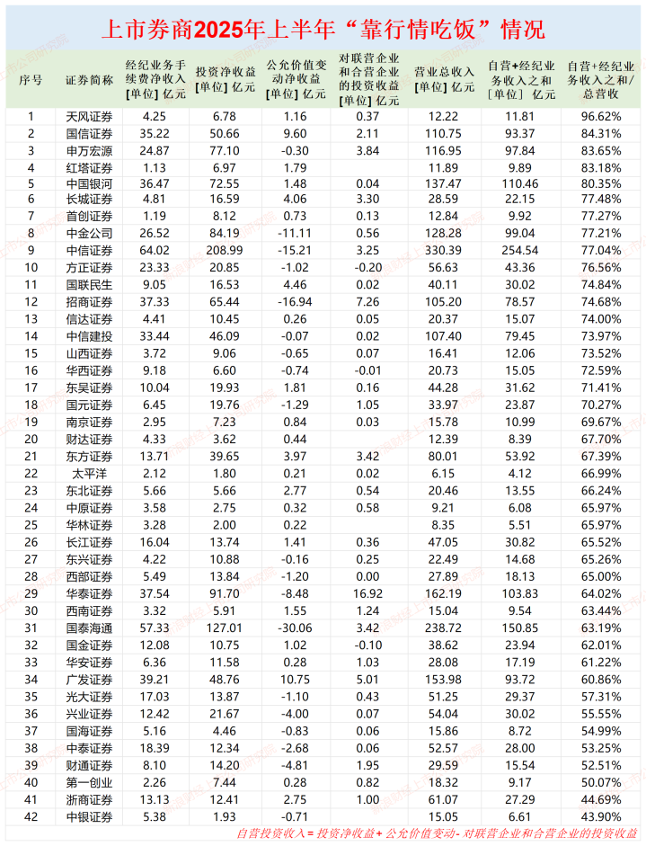 在乐观的行情下,券商的自营投资业务收入和经纪业务收入都大幅增长。今年上半年,42家纯证券业务上市券商合计实现自营收入(根据“自营投资收入=投资净收益+公允价值变动-对联营企业和合营企业的投资收益”公式计算,下同)1123.53亿元,同比增长53.53%;42家券商合计实现经纪业务手续费净收入634.54亿元,同比增长43.98%。